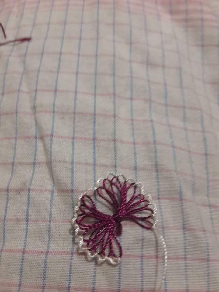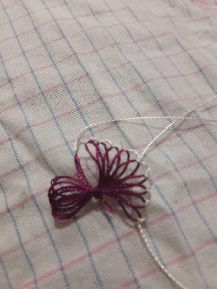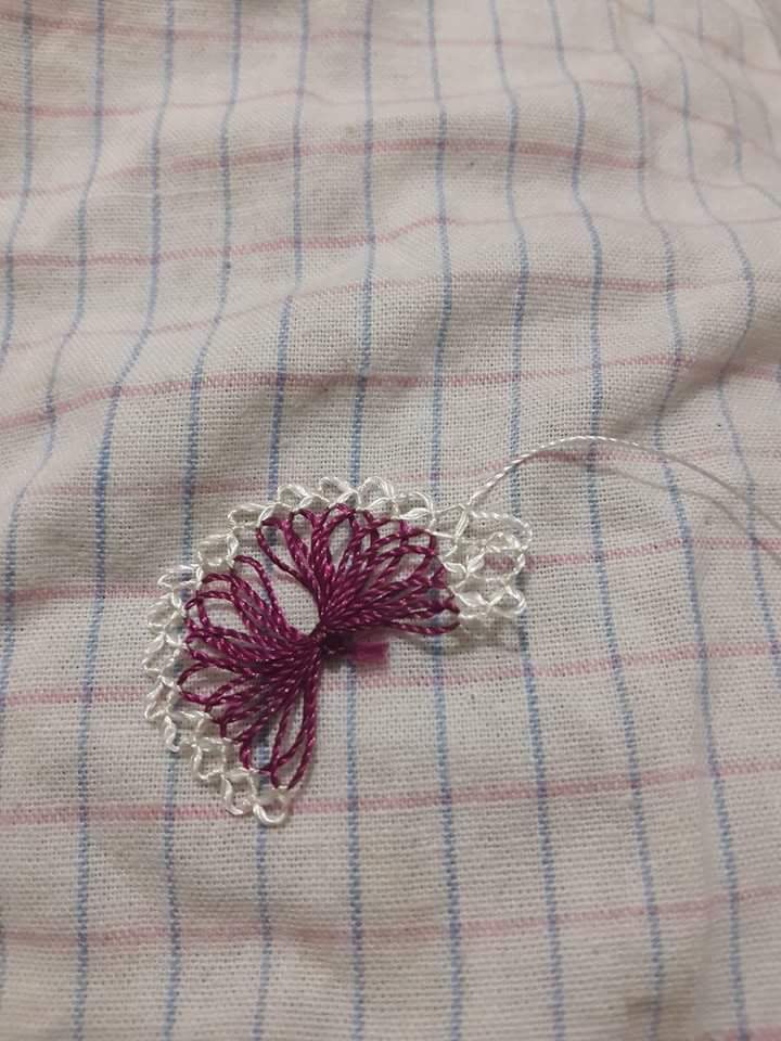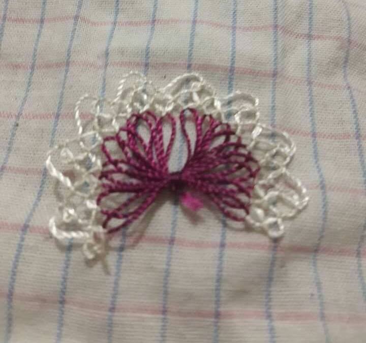 Şimdi nasıl yapıldığından biraz anlatalım. Oya ipinizi çatalın etrafına sıkı bir şekilde sarmanız gerekiyor. Sardıktan sonra ortadan sıkıca bir düğüm atıp ipi kesiyorsunuz. Yaptığınız oyanın ilk kısmını çataldan yavaşça çekip çıkarın. Sonrasında ise aşağıdaki resimlerde olduğu gibi iğne oyası ile beyaz ipi kullanarak oyanın çevresini süsleyin. Bu süsleme sonucunda çiçek oyasını elde edeceksiniz.